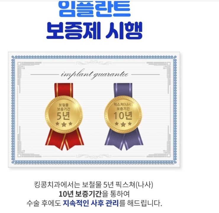 임플란트 보증제 시행하고,킹콩치과는 보철물 5년 픽스쳐 10년 보증기간을 통하여 수술 후에도 지속적인 사후관리를 해드리고 있습니다.
