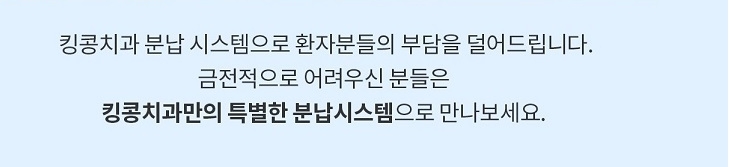 안전한 분납 시스템은 환자분들의 부담을 덜어드리고, 금전적으로 어려우신 분들은 킹콩치과만의 특별한 분납시스템으로 만나 보실가 있습니다.