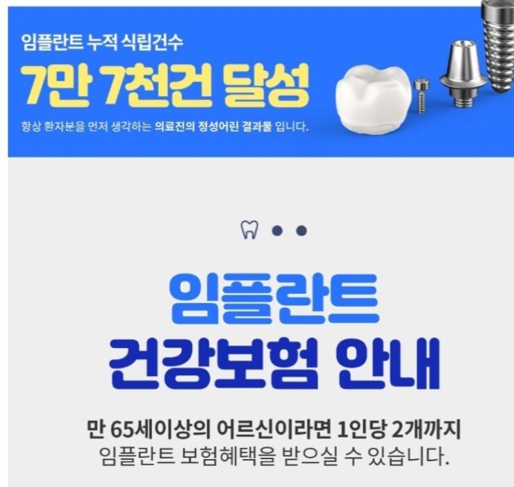 콩치과 임플란트이고, 만 65세 이상 어르신이라면 1인당 2개까지이며 임플란트 보험혜택을 받으실 수 있습니다. 65세 이상 임플란트 건강보험적용되고, 보험 임플란트 개당 37만원 가능하고, 임플란트 보증제 시행을 하고, 킹콩치과에서는 보철물 5년 픽스쳐(나사) 10년 보증기간을 통하여 수술 후에도 지속적인 사후 관리를 해드립니다.
