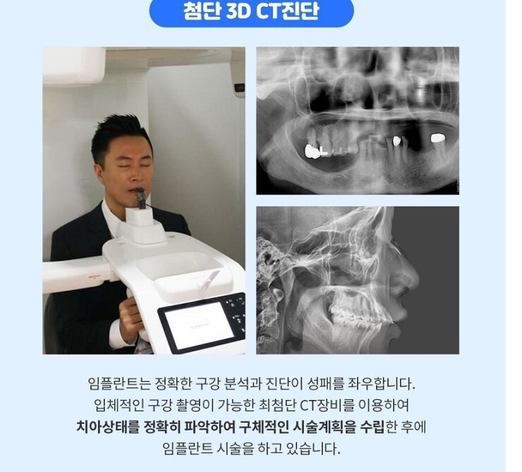 첨단 3D CT진단 임플란트는 정확한 구강 분석과 진단의 성패를 좌우하고, 입체적으로 구강촬영이 가능한 최첨단 CT장비를 이용하여 치아상태를 정확히 파악하여 구체적인 시술계획을 수립한 후에 임플란트 시술을 하고 있습니다.