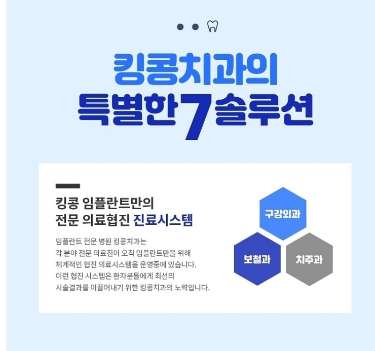 킹콩치과의는 특별한 7솔루션는 킹콩 임프란트의 전문 의료협진 진료시스템 임플란트 전문병원 킹콩치과는 각 분야의 전문 의료진이 오직 임플란트만을 위해 체계적인 협진 의료시스템을 운영중에 있습니다. 이런 협진 시스템읁 환자분들에게 최선의 시술결과를 이끌어내기 위한 킹콩치과의 노력을 하고 있습니다. 협진하는 것 곳은 구강외과,보철과,치주과과 있습니다.