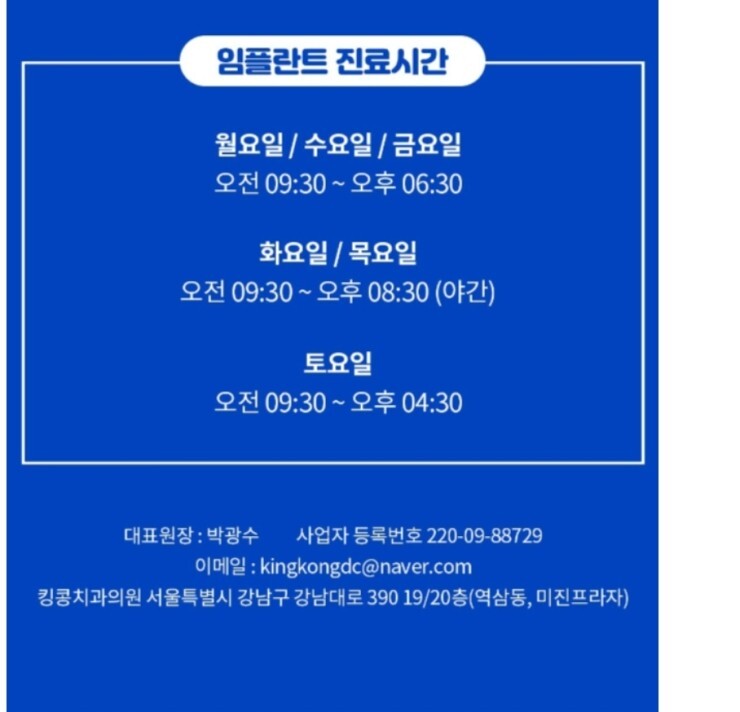 킹콩치과 진료시간 및 위치를 안내를 하고 있습니다.
